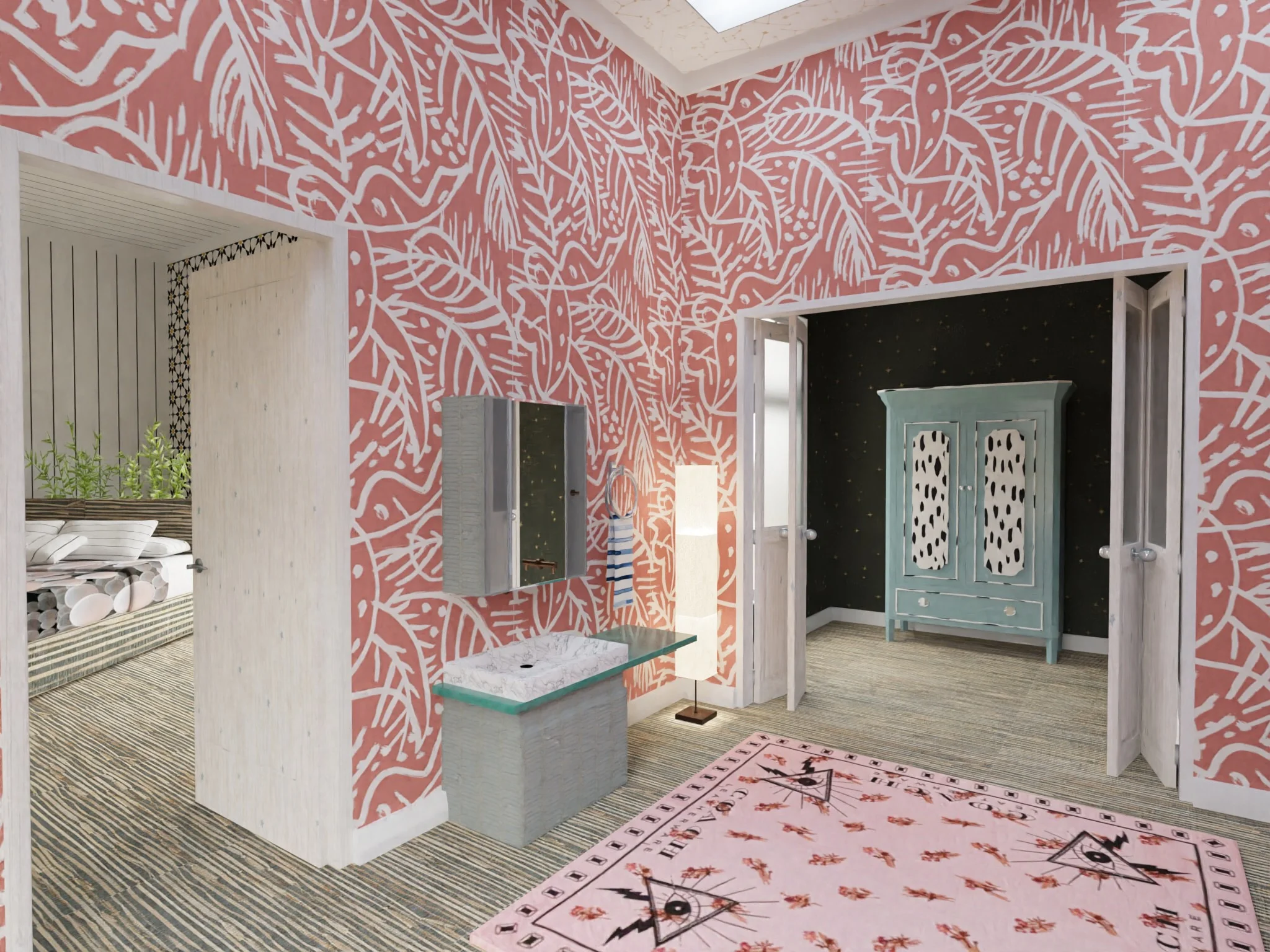 Bedroom used as backdrop for bathroom